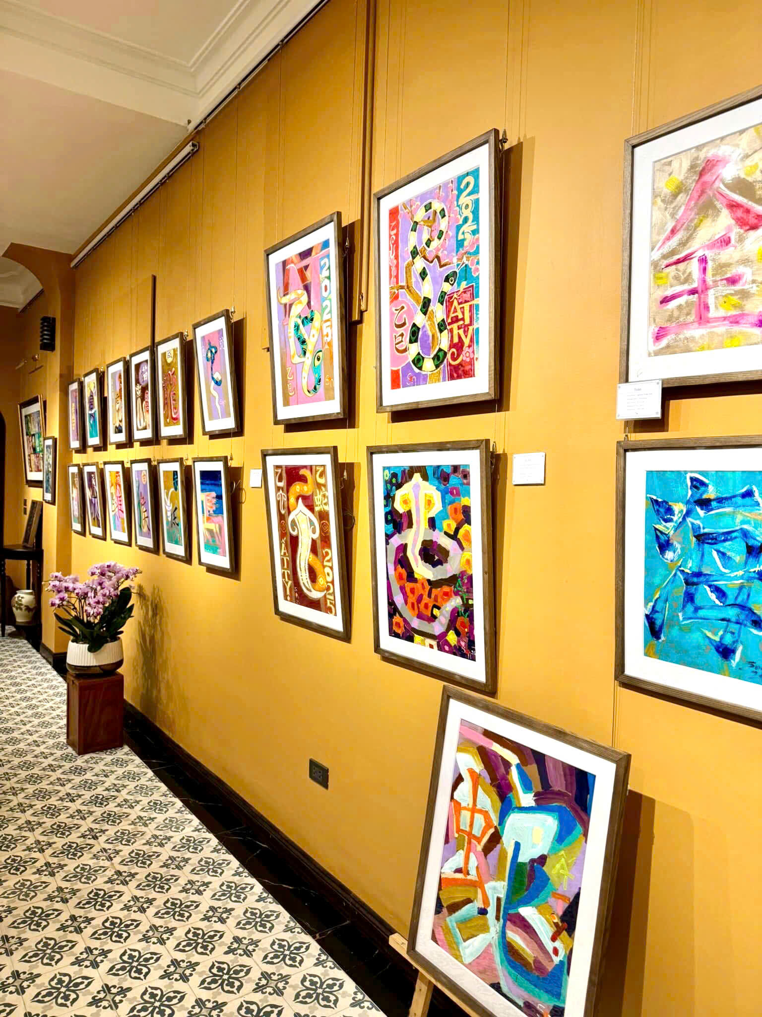 Một góc triển lãm tranh có bộ tranh rắn của họa sĩ Nguyễn Doãn Sơn. |