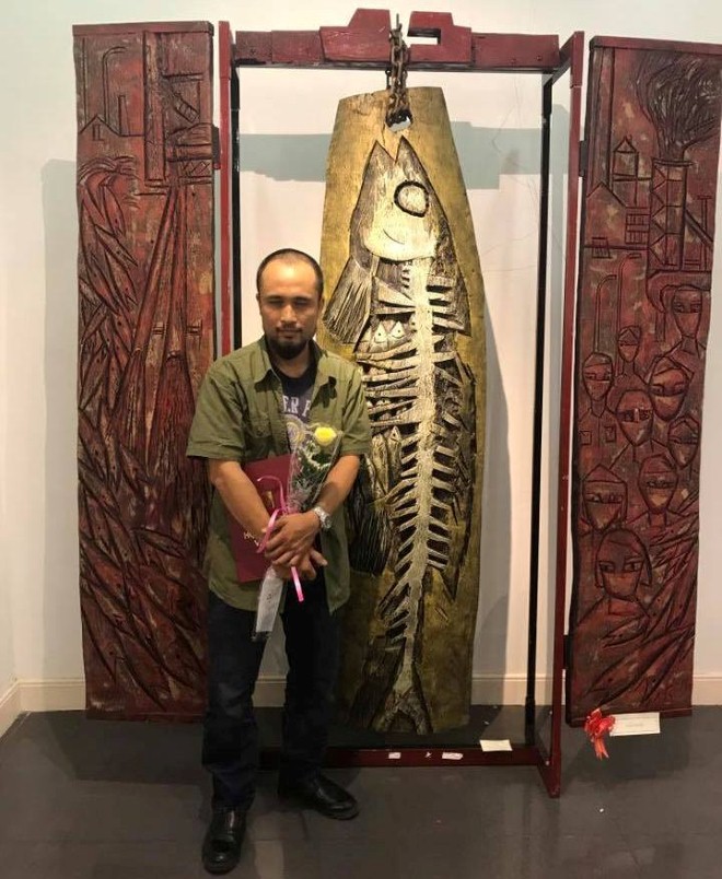 Họa sĩ Kù Kao Khải và tác phẩm "Chuông" - giải Nhất Hội Mỹ thuật Việt Nam 2017 - Ảnh: Báo Thể thao văn hóa. |