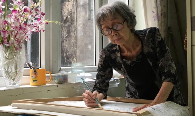 Khi tuổi đã cao, họa sĩ Nguyễn Minh Mỹ vẫn miệt mài với cây cọ. |