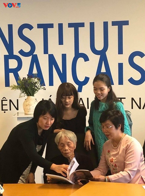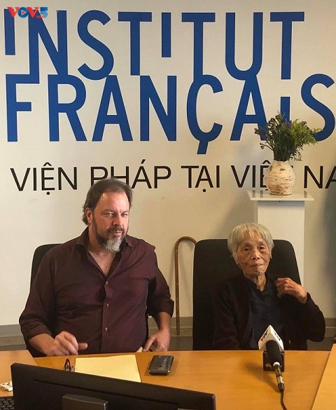 Ông Thiery Vergon, Giám đốc Viện Pháp tại Hà Nội và họa sĩ Mộng Bích tại buổi họp báo trước triển lãm. Đây cũng là lần đầu tiên nữ họa sĩ xuất hiện trước đông đảo báo giới. |