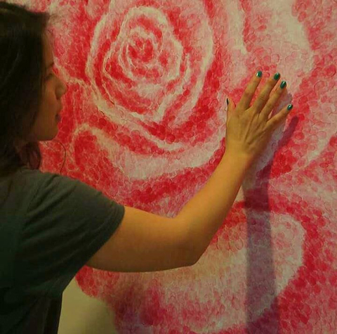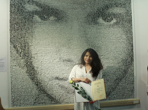 | Vũ Bạch Liên bên tác phẩm"Họ- một phần cuộc sống của tôi" - Ảnh: Báo Thể thao văn hóa |