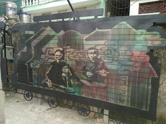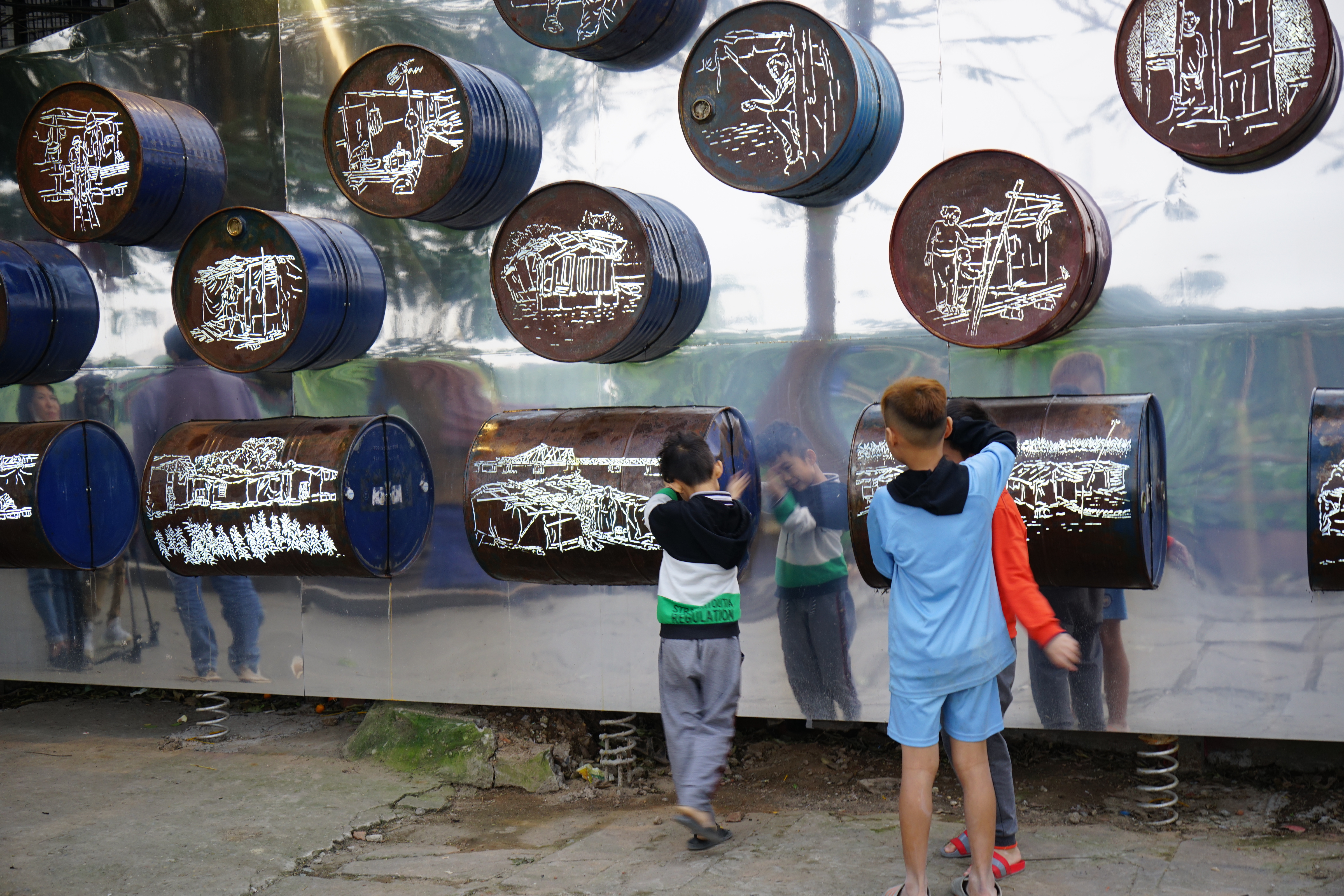 Ở một mảng tường khác, trên nền 20 chiếc thùng phuy, sử dụng công nghệ cắt khắc xuyên thủng bằng laser kết hợp chiếu sáng bằng đèn LED, nghệ sĩ Lê Đăng Ninh kể lại câu chuyện về những ngôi nhà nổi của bãi giữa sông Hồng. Dường như anh đem đến một cái nhìn nhân văn và cũng đầy xót xa về những góc khuất trong cuộc sống của những người dân ngụ cư nơi bãi giữa sông Hồng. Nghệ sĩ Lê Đăng Ninh bày tỏ:“Tôi muốn khán giả và chính người đã từng sống trên không gian ấy họ cảm nhận về nơi họ đã từng sống. Tôi có làm hai cái tay để mọi người để mọi người có thể rung lắc, và hệ thống lò xo cũng có thể làm rung lắc. Khi thành phố lên đèn những ngôi nhà lênh đênh trên dòng nước không khác du thuyền. Tôi cảm nhận được sự ba chìm bảy nổi của những người dân trên những ngôi nhà ấy. Họ dường như chưa thuộc về thành phố dù họ ở ngay bên cạnh những khu dân cư vô cùng sầm uất…”