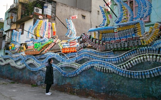 Với chiều dài hơn 10m và cao 3,5m, nhiều người có lẽ sẽ ấn tượng với tác phẩm Thuyền của nghệ sĩ Vũ Xuân Đông. Bốn con thuyền được làm từ hơn 10.000 vỏ chai nhựa mà Vũ Xuân Đông đã kêu gọi thu thập 3 tháng trước khi bắt tay vào thực hiện tác phẩm. Những con thuyền với những làn sóng lô nhô gợi nhắc về một miền ký ức xa xưa đối với người dân vùng ven sông. Những ngày buôn bán, sinh hoạt tấp nập trên bến, dưới thuyền ở ngay bến sông Hồng là điều Vũ Xuân Đông muốn nhắc đến trong câu chuyện hôm nay. Nghệ sĩ Vũ Xuân Đông chia sẻ thêm: “Trước khi quyết định vật liệu để tạo ra tác phẩm này, tôi nghĩ ngay đến chai nhựa. Thực ra nhiều nghệ sĩ trên thế giới và đã thành công. Chai nhựa là một vật đặc trưng trong xã hội tiêu dùng, tôi thấy hình thể đó có sẵn, thiết kế rất đẹp. Chất liệu vừa tạo hình vừa có thể sử dụng ánh sáng được. Đặc biệt những chai nhựa trong và nhựa màu”.