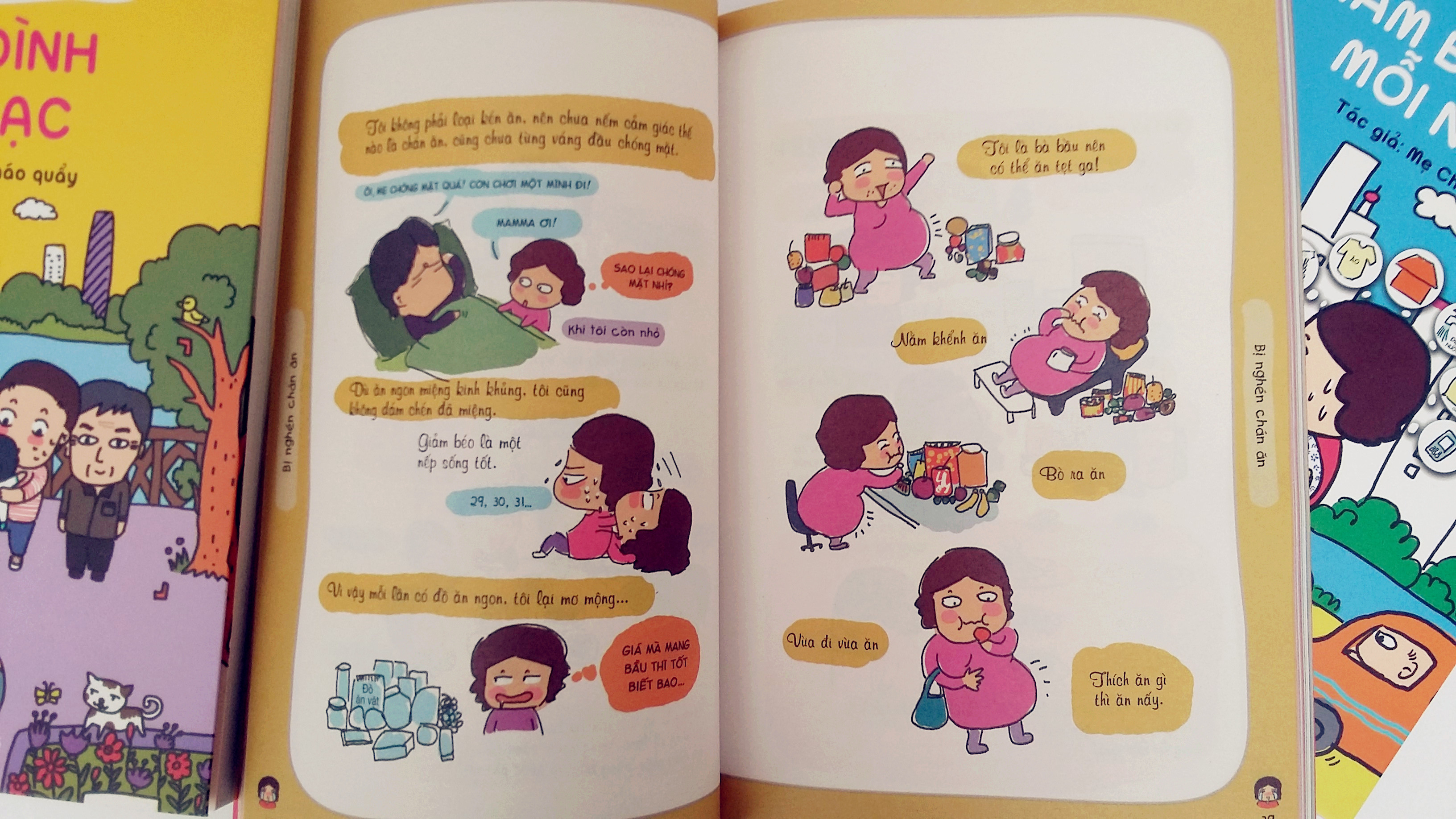 Dưới nét vẽ ngộ nghĩnh và lối kể chuyện hài hước, mẹ Cháo quẩy dắt tay người đọc bước vào thế giới tràn ngập màu sắc, đủ đầy những tâm trạng khác nhau của người phụ nữ: mừng rỡ khi có bầu, mệt mỏi lúc ốm nghén, hay giai đoạn chăm con nhỏ tất bật lo toan.