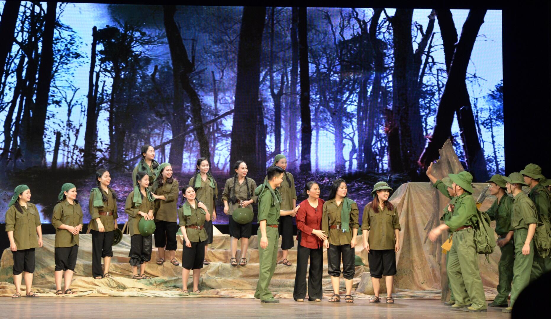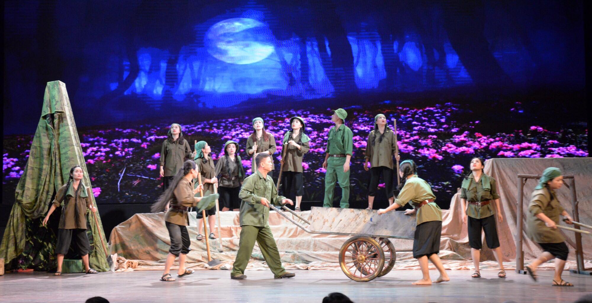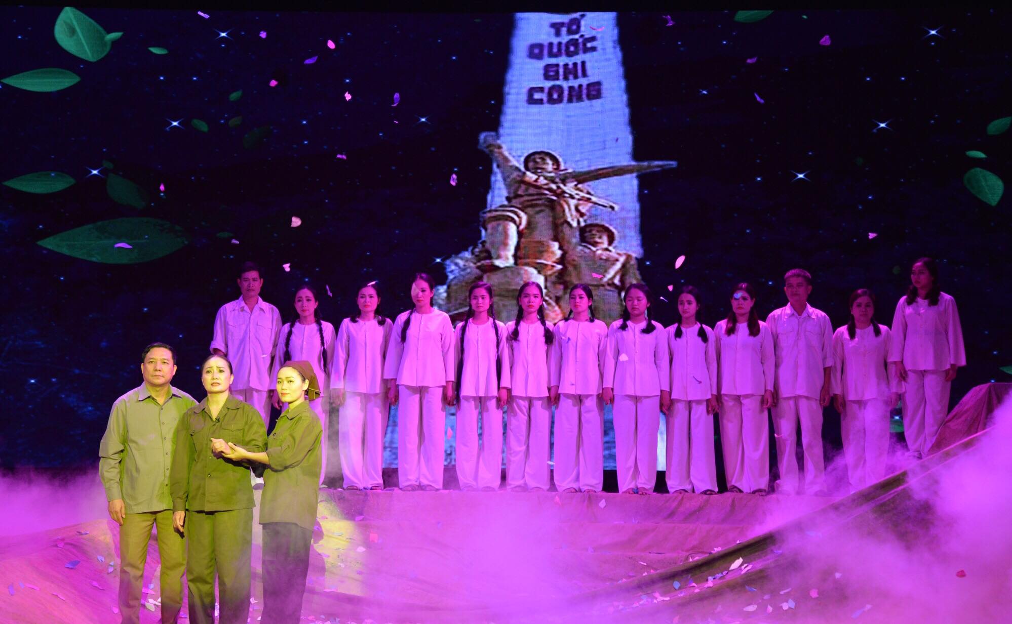 Bối cảnh sân khấu là tọa độ lửa Truông Bồn, nơi 13 thanh niên xung phong của Tiểu đội 2, Tiểu đội Cảm tử thuộc Đại đội 317 - Đội 65 - Tổng Đội Thanh niên xung phong chống Mỹ cứu nước tỉnh Nghệ An đã anh dũng hy sinh trong khi làm nhiệm vụ vào ngày 31/10/1968. - Ảnh: Hà Khánh |