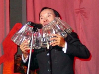 | Tiết mục thổi kèn chai của nghệ sĩ Mai Đình Tới - Ảnh:tuoitre.vn |