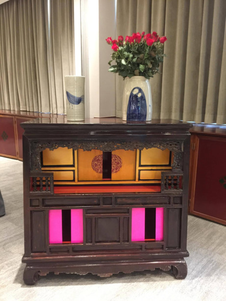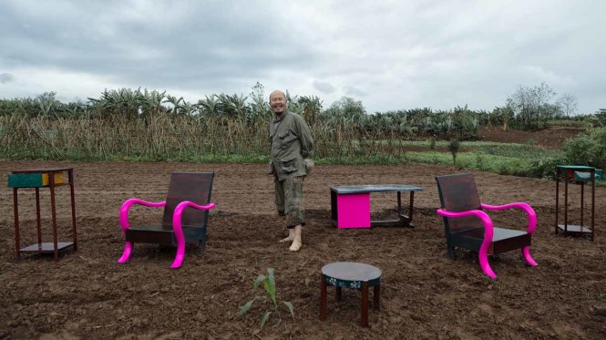 Ví như bộ bàn ghế xa-lông cũ, anh gần như giữ nguyên chỉ phủ lên hai thành ghế một màu sơn đỏ hồng được pha chế theo kỹ thuật sơn ta, tạo sự tương phản. Hoặc là cái kệ được làm từ chiếc thớt, Đinh Công Đạt đã bỏ 100% công năng và 95% cái nhìn thấy bằng thị giác của cái thớt để làm một món đồ mới; mới cả hình hài và giá trị sử dụng. Bộ bàn ghế và cái tủ nữa, qua con mắt thiết kế của người nghệ sỹ nó vừa mang tính nghệ thuật vừa có giá trị kinh tế rất cao, như anh “bật mí” có giá lên tới 4-5 ngàn đô-la Mỹ.
