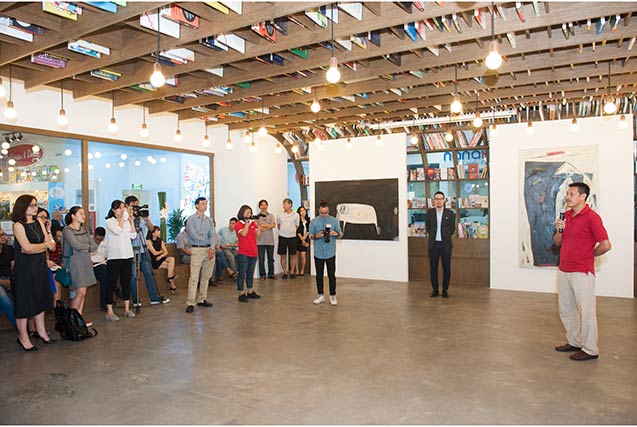 | Nghệ sĩ Hà Trí Hiếu chia sẻ với khách mời về triển lãm |