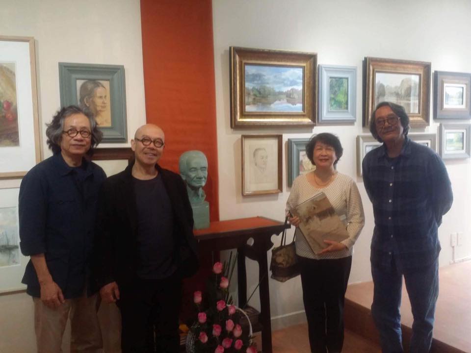 | Dịch giả, họa sĩ Trịnh Lữ bên những người bạn tại triển lãm tranh và ra mắt sách ở căn nhà xưa 108 Quán Thánh, Hà Nội. Bức tượng chân dung họa sĩ Trịnh Hữu Ngọc trang trọng giữa triển lãm - Ảnh: Fb Trịnh Lữ |