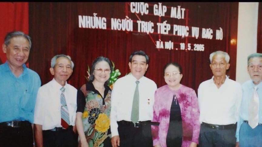 Hàng năm, những người trực tiếp phục vụ Chủ tịch Hồ Chí Minh đều tổ chức gặp mặt vào 19/5, và dâng hương tưởng nhớ Người. (NSUT Trần Ngà mặc áo hoa vàng). |