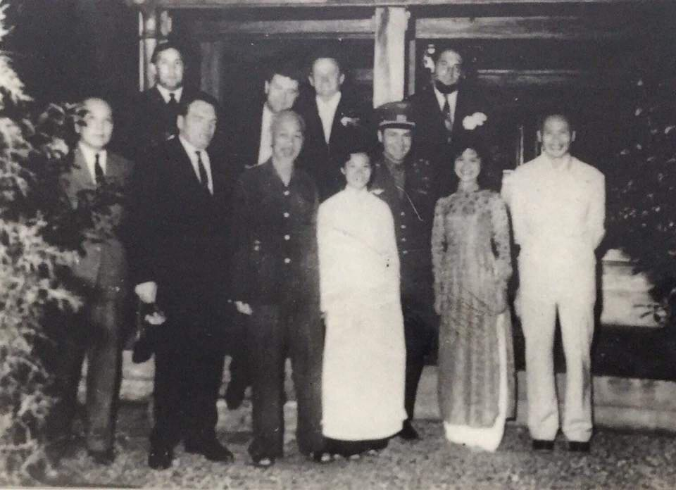 Chủ tịch Hồ Chí Minh và Thủ tướng Phạm Văn Đồng đón tiếp Anh hùng Liên Xô, phi công vũ trụ G.Ti-tốp, chụp ảnh lưu niệm trước nhà sàn của Bác, NSUT Trần Ngà thứ hai từ phải (ngày 13/11/1966). |