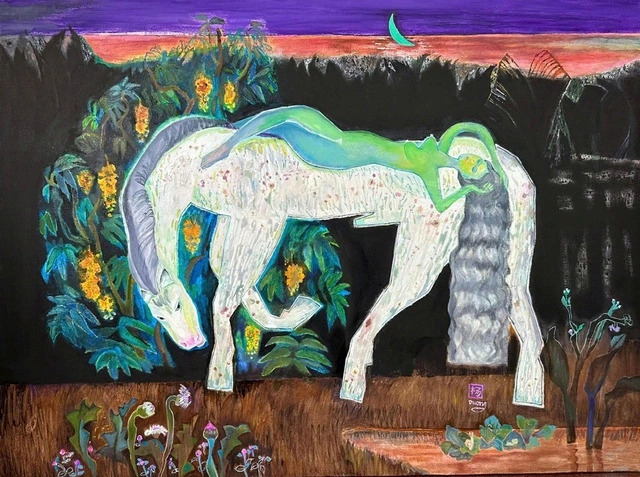 Tác phẩm Đêm hè (Ngựa mơ 2, sơn dầu, 90x120 cm) của họa sĩ Đặng Thị Dương trong triển lãm Hai đường thẳng song song - Một điểm đến từ 26/2- 4/3 tại Hội mỹ thuật TP Hồ Chí Minh, 218A Pasteur, P.Xuân Hòa, TP.HCM - Ảnh: Tiểu Tân/ Báo Thanh niên |