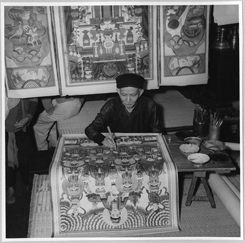 | Gian hàng tranh ngày Tết đầu thế kỷ 20. Ảnh Jean Manikus và phụ tá Nguyen Huu Tho/ Nguồn: Viện Viễn Đông Bác Cổ |