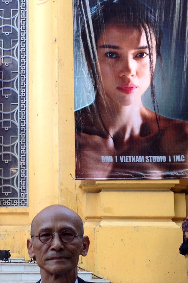 | Nhà văn Nguyễn Văn Thọ trước pano quảng cáo phim Quyên |