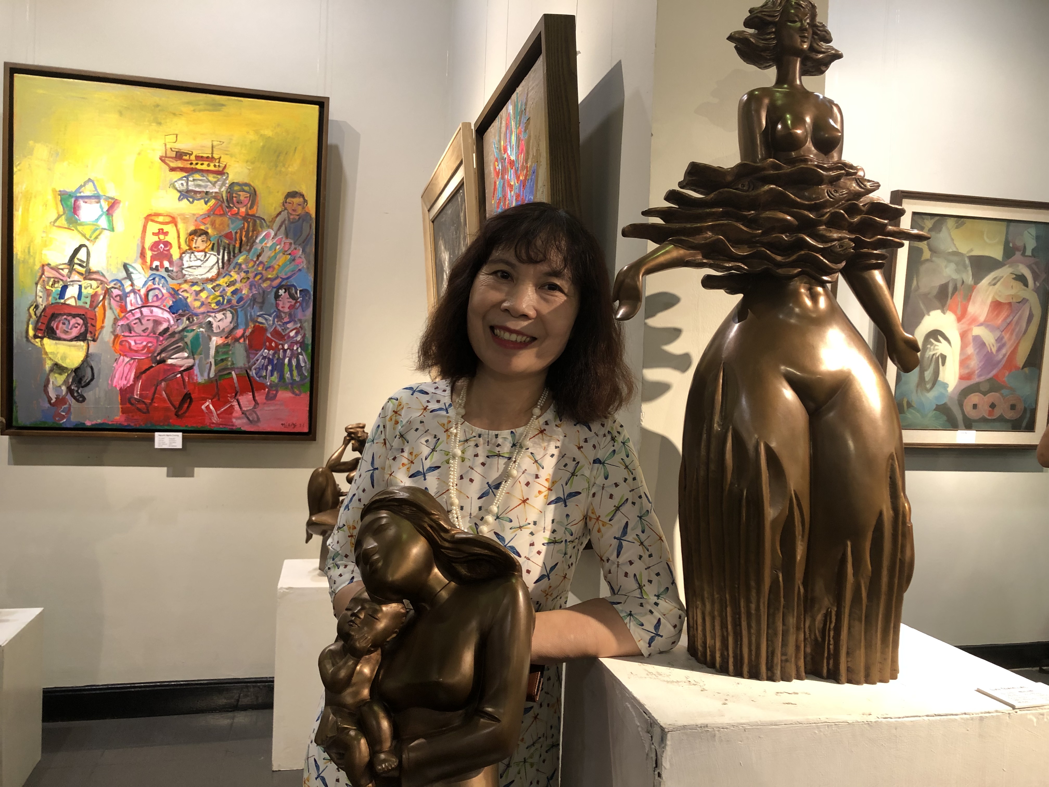 Nhà điêu khắc Lưu Thanh Lan tại triển lãm. |