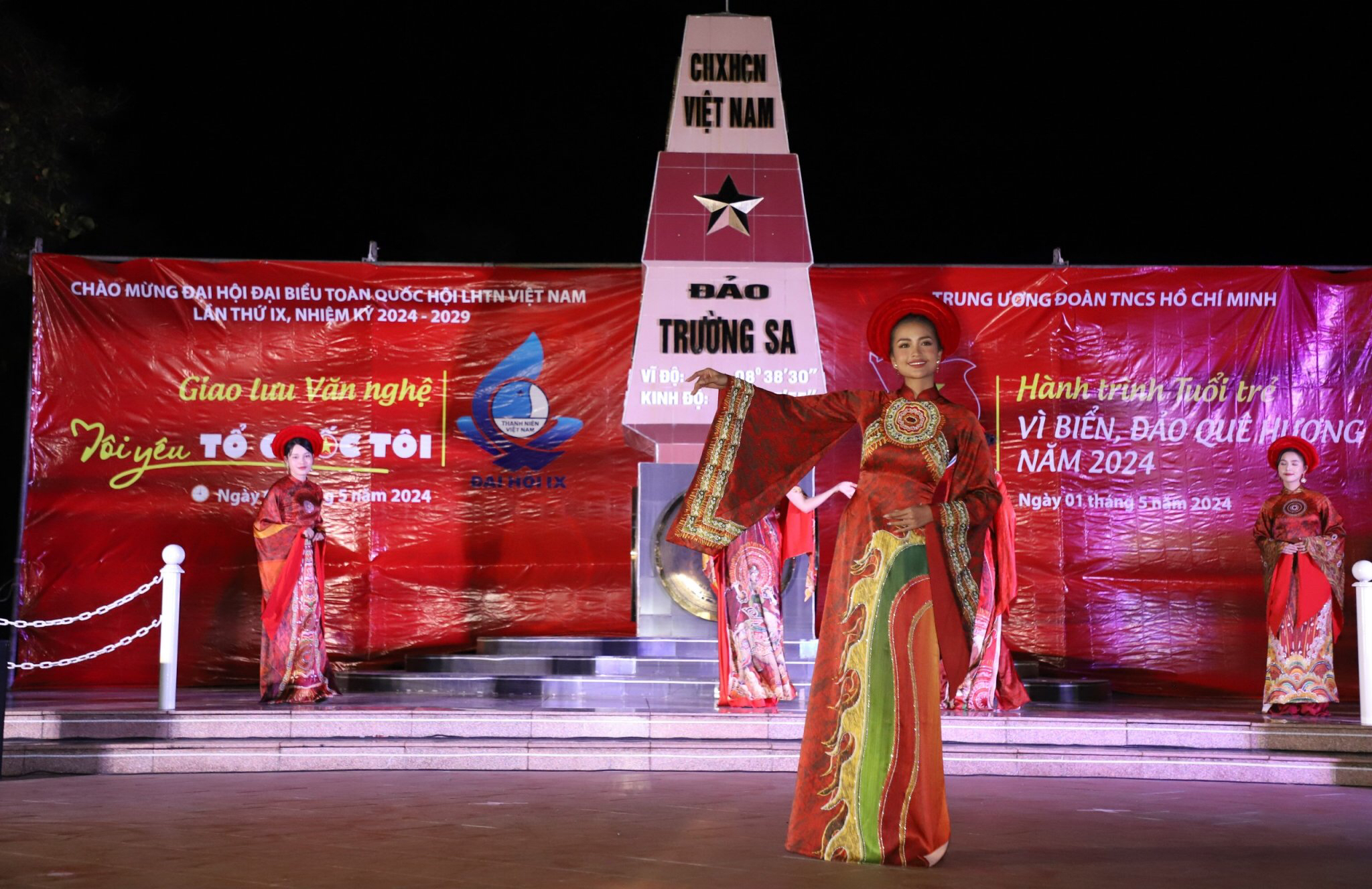 Trình diễn giới thiệu bộ sưu tập áo dài "Tự hào biển dảo Việt Nam" của NTK Nguyễn Việt Hùng tại Trường Sa lớn Ảnh:: Ngô Tùng. |