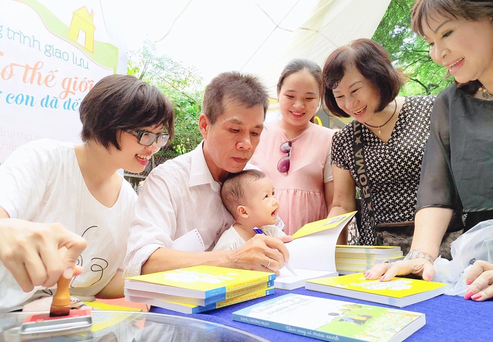 Gia đình nhà thơ Lê Minh Quốc trong buổi ra mắt sách Chào thế giới bây giờ con đã đến. - Ảnh: NVCC |