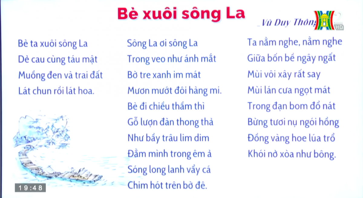 Tuổi thơ của nhiều người đi học hẳn không thể quên được bài thơ "Bè xuôi sông La" của Vũ Duy Thông đã được đưa vào SGK Tiểu học suốt bao năm qua. Bài thơ được viết từ năm 1967, trong bối cảnh cuộc kháng chiến chống Mỹ của quân và dân ta đang diễn ra vô cùng ác liệt. Vậy mà những câu thơ 5 chữ lại mang đến cho người đọc một vẻ đẹp bình yên, thơ mộng của dòng La, vẻ đẹp ấy vượt lên những đau thương gian khổ, mang lại cảm giác lạc quan, tin tưởng vào một ngày mai tươi sáng: "Bè đi chiều thầm thì/Gỗ lượn đàn thong thả/Như bầy trâu lim dim/Đắm mình trong êm ả/Sóng long lanh vẩy cá/Chim hót trên bờ đê/Ta nằm nghe nằm nghe/Giữa bốn bề ngây ngất/Mùi vôi xây rất say/Mùi lán cưa ngọt mát/Trong đạn bom đổ nát/Bừng tươi nụ ngói hồng/Đồng vàng hoe lúa trổ/Khói nở xòa như bông".