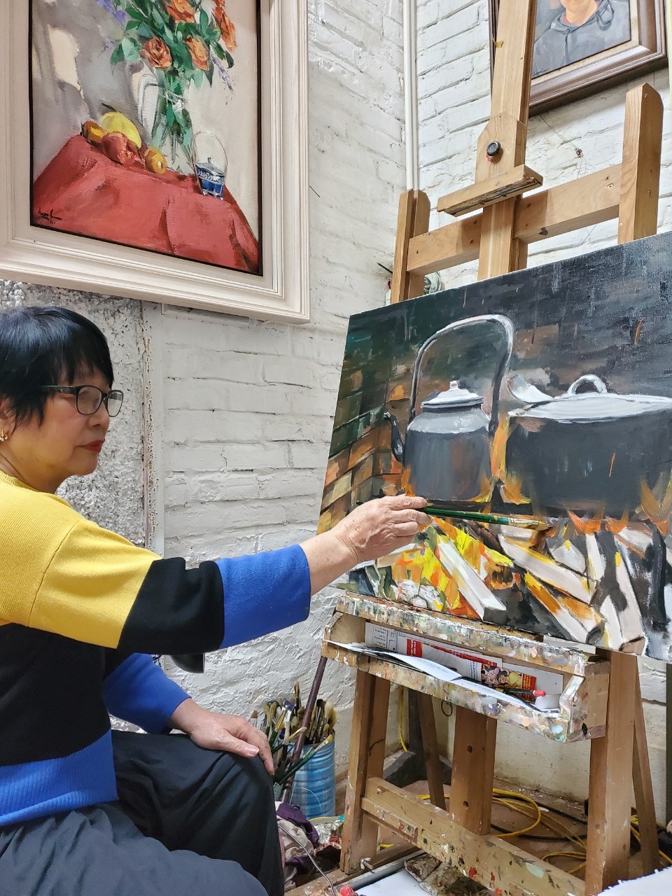 Nhà văn, họa sĩ Trần Thị Trường trong phòng vẽ của mình |