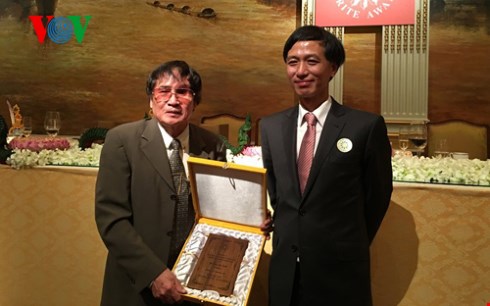 | Nhà văn Trần Mai Hạnh cùng Đại sứ Việt Nam tại Thái Lan Nguyễn Tất Thành (phải) bên Kỷ niệm chương Giải thưởng văn học ASEAN |