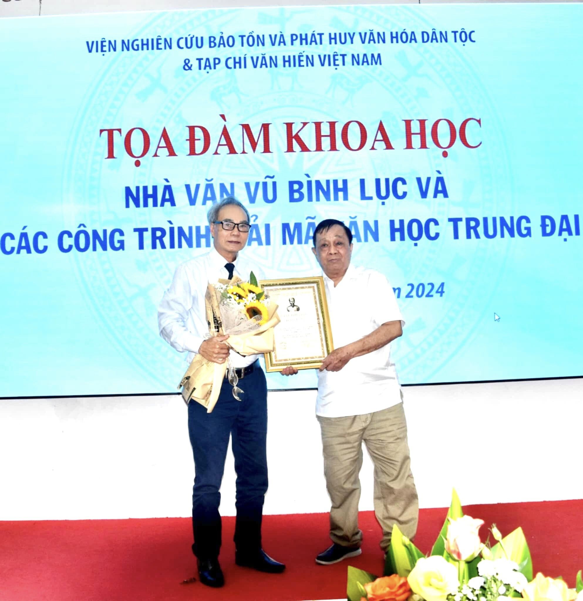 Trong khuôn khổ tọa đàm, Viện nghiên cứu Bảo tồn và Phát huy văn hóa dân tộc cùng Tạp chí Văn hiến Việt Nam đã trao tặng Giải thưởng Đào Tấn cho nhà văn Vũ Bình Lục nhằm ghi nhận những đóng góp to lớn của ông. Giải thưởng được khởi xướng lần đầu cách đây 24 năm tôn vinh những tập thể, cá nhân có đóng góp tích cực cho việc bảo tồn, phát huy các giá trị văn hóa, nghệ thuật truyền thống của dân tộc. Đây là một sự tôn vinh xứng đáng bởi từ lâu nhà văn Vũ Bình Lục đã được giới chuyên môn và bạn đọc đánh giá là một hiện tượng hiếm lạ trong nền nghiên cứu, phê bình văn học, chuyên gia hàng đầu về văn học Trung đại nước ta.