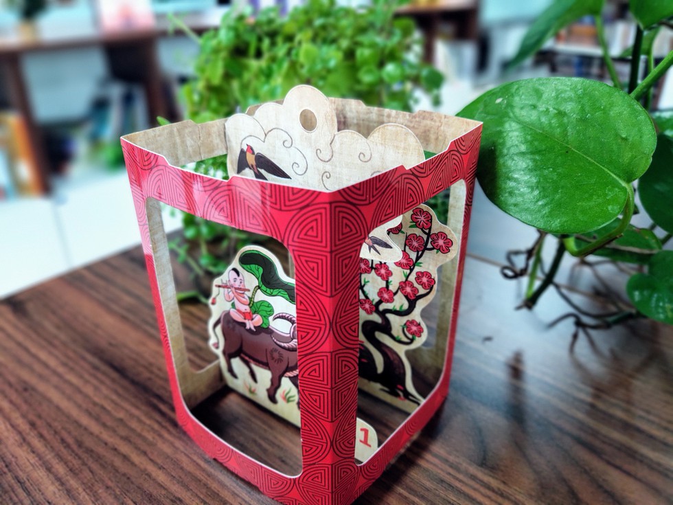 Mỗi cuốn sách Nhâm nhi tết – Tân Sửu 2021 được tặng kèm một tấm thiệp xuân với hình thức pop-up 3D độc đáo - chiếc đèn lồng họa cảnh để treo lên cành đào cành mai. |