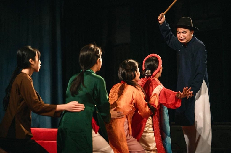 Vở kịch “Chén thuốc độc” được dàn dưng lại được công diễn trong Tuần lễ kỷ niệm 100 năm sân khấu kịch nói Việt Nam. Vai thầy Thông Thư (đứng) do diễn viên Mai Nguyên đảm nhiệm - Ảnh: Nhà hát Kịch Việt Nam |