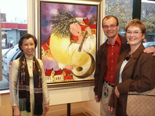 | Patricia Minh Hương tại triển lãm ở Gallery Richelieu cùng khách mua tranh - Ảnh do nhân vật cung cấp |