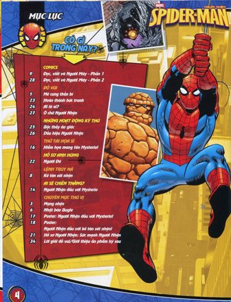 Mang “Tinh thần hiệp sĩ thành phố”, ấn phẩm gồm những câu chuyện thú vị về cuộc phiêu lưu chống lại cái ác của Người Nhện, khuyến khích các em sống có trách nhiệm với cộng đồng, biết đoàn kết để bênh vực kẻ yếu. Bên cạnh đó, còn có nhiều phần giúp các em phát triển kĩ năng bản thân như: Đố vui, Thử tài vẽ tranh, Những hoạt động kỳ thú…
