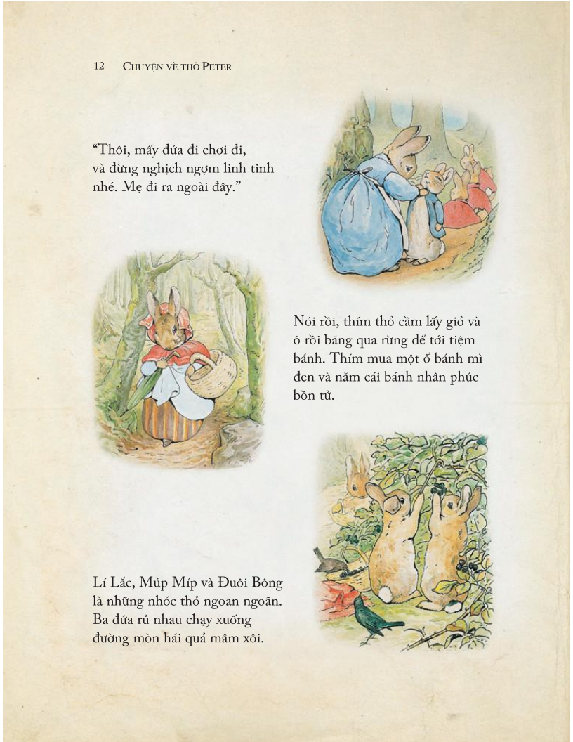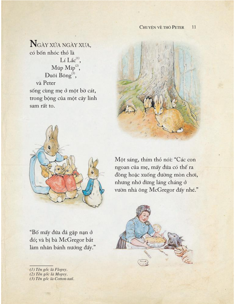Điểm đặc sắc của cuốn sách là, ngoài phần truyện và tranh như nguyên bản, cuối mỗi truyện còn có thêm những lá thư Beatrix viết cho độc giả của mình trong vai các nhân vật như thỏ Peter, thỏ Benjamin, nhái Jeremy, mèo Tom Nhí... Những lá thư này mang tới hơi thở chân thực cho các câu chuyện tưởng tượng của bà và sẽ khiến các độc giả nhí rất thích thú. Ngoài ra sách còn có thêm một phần Nhắn nhủ nho nhỏ, để giúp bố mẹ mượn truyện nhắc nhở các con, vốn là các em nhỏ nghịch ngợm, hiếu kì không kém gì các nhân vật trong truyện.
