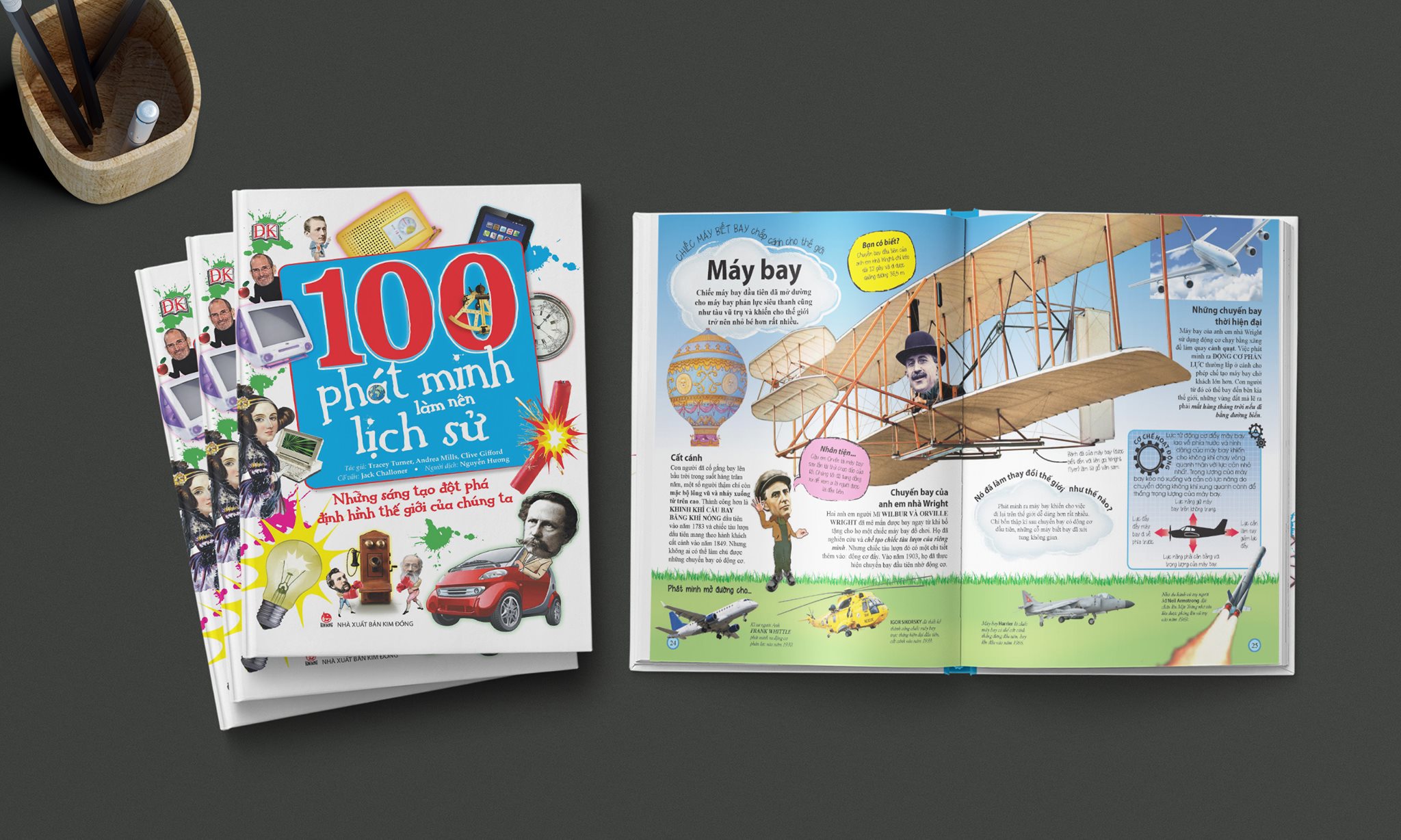 “100 phát minh làm nên lịch sử” đem đến cái toàn cảnh về những sáng tạo đột phá giúp định hình thế giới của chúng ta. Đằng sau 100 phát minh đáng kinh ngạc là câu chuyện hậu trường về sự ra đời của các loại dụng cụ và thiết bị tuyệt vời nhất trên thế giới. Từ bánh xe, bóng điện đến chiếc máy bay đầu tiên và những vật dụng hàng ngày trong đời sống như ôtô, tivi hay công nghệ in ấn... cuốn sách điểm lại lịch sử các phát minh đã làm thế giới thay đổi nhiều nhất, đem lại niềm cảm hứng lớn lao cho độc giả trẻ yêu thích khám phá những điều kì diệu của nhân loại. Danh mục Thuật ngữ ở cuối sách và phần tra cứu theo vần (index) kì công giúp người đọc dễ dàng tìm kiếm thông tin gốc và chi tiết.