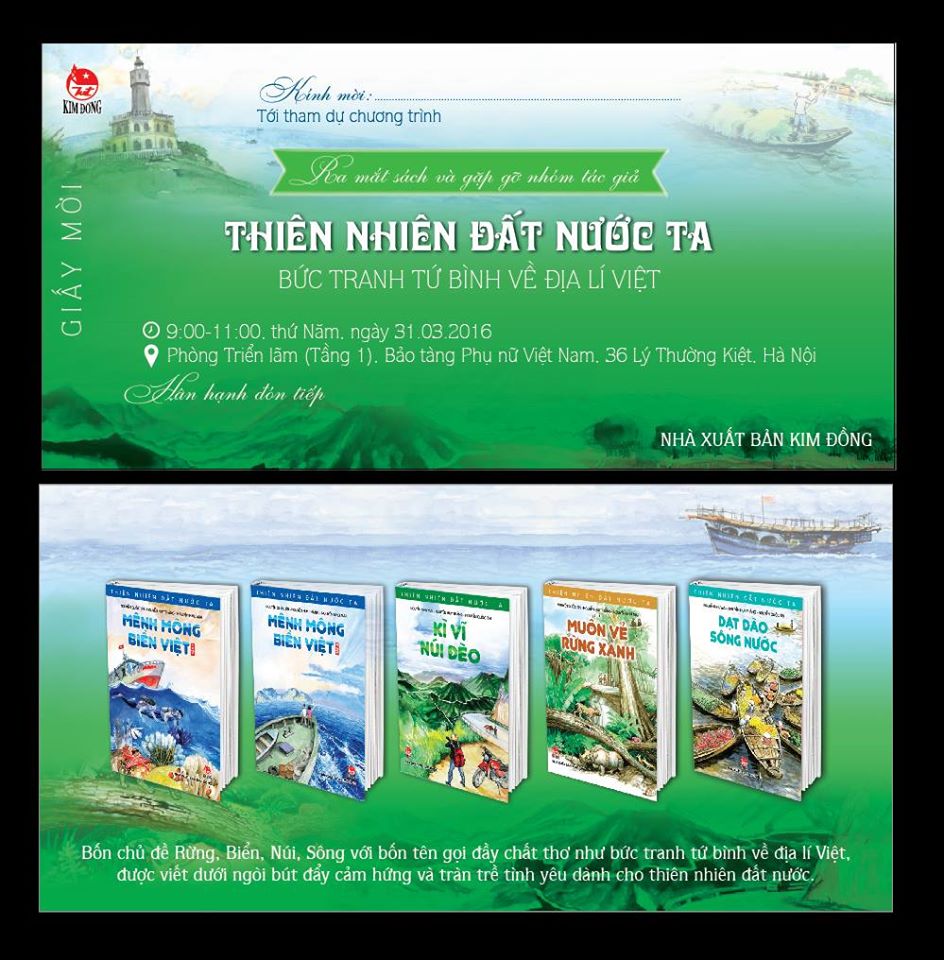 9 giờ sáng thứ Năm, ngày 31.03.2016, tại Phòng Triển lãm - Bảo tàng Phụ nữ Việt Nam, 36 Lý Thường Kiệt, trong khuôn khổ Hội sách Mùa Xuân, Nhà xuất bản Kim Đồng tổ chức Ra mắt và gặp gỡ nhóm tác giả bộ sách Thiên nhiên đất nước ta gồm Nguyễn Quốc Tín – Nguyễn Huy Thắng – Nguyễn Như Mai.