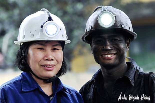 Nhà văn Vũ Thảo Ngọc chụp ảnh cùng thợ mỏ. - Ảnh: Mạnh Hùng. |