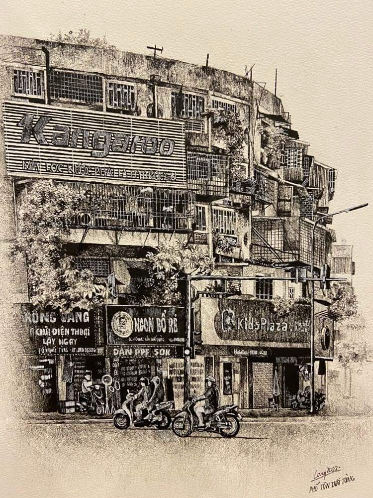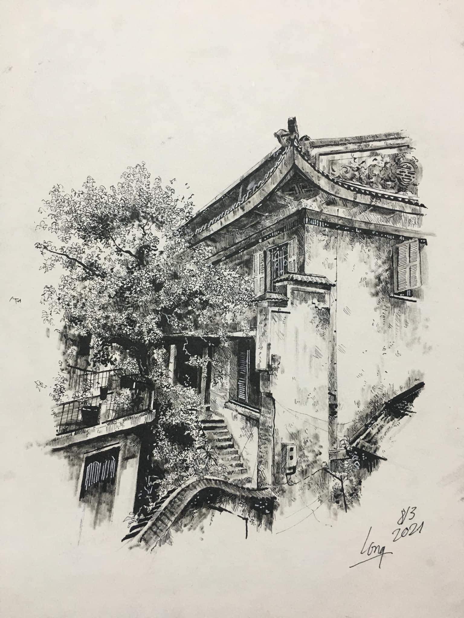 Những ai đã từng ngắm các tác phẩm hội hoạ của Long, đều vô cùng thích thú bởi kỹ năng vẽ kiến trúc xuất sắc, diễn tả chi tiết sống động không gian về phố Hà Nội.