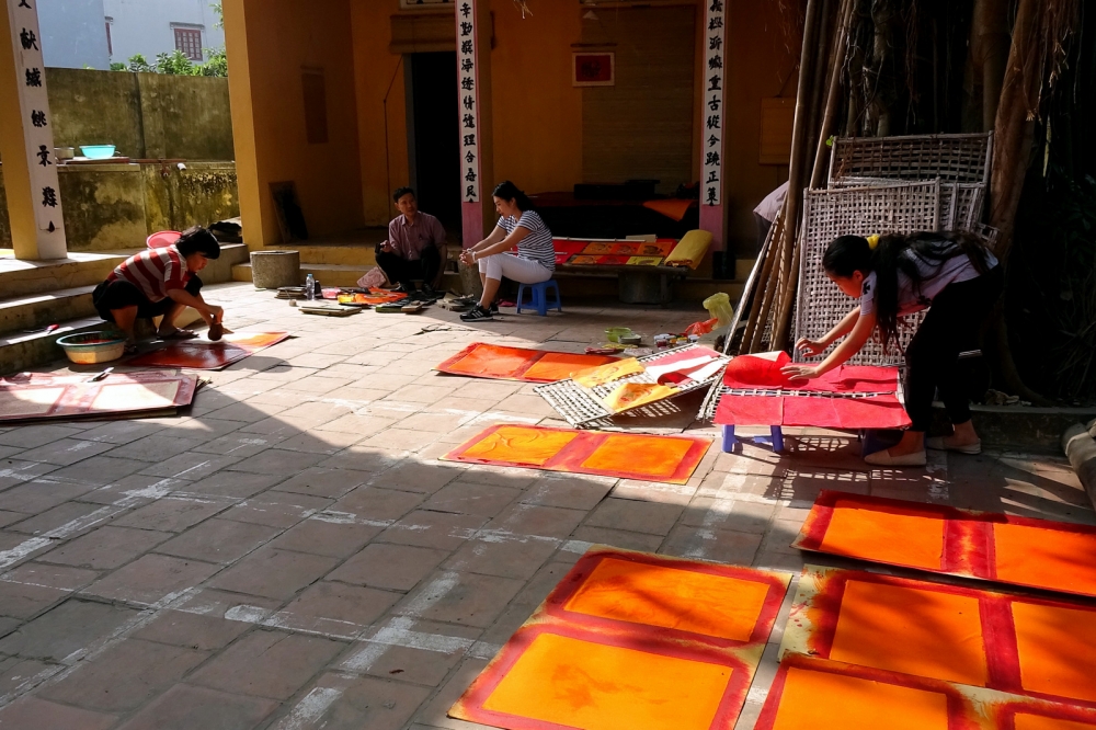 Sau khi tìm hiểu qua các tài liệu cũ và nhờ các nghệ nhân của tranh Hàng Trống, tranh Đông Hồ phân tích được một số mẫu tranh của Kim Hoàng, chị Hòa nhờ các nghệ nhân “đồ” lại tranh với kích thước như thật, rồi từ bức tranh này, những nghệ nhân điêu khắc đã khắc lại trên ván gỗ.
