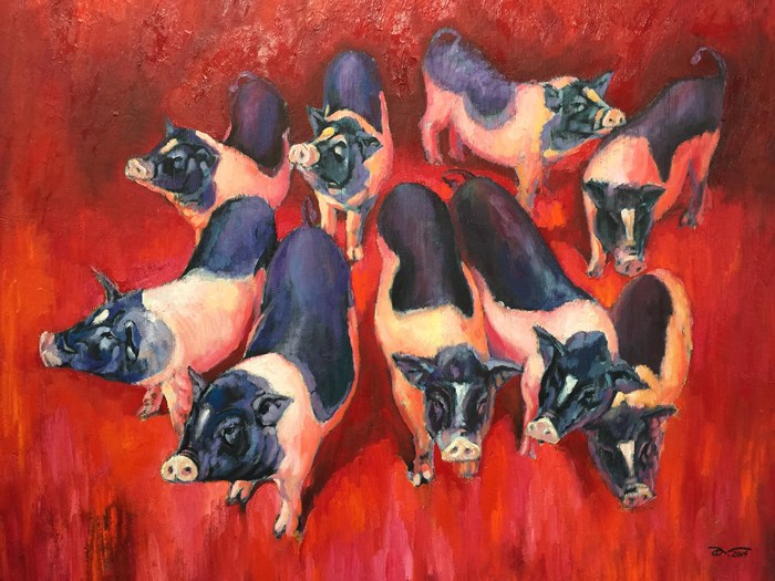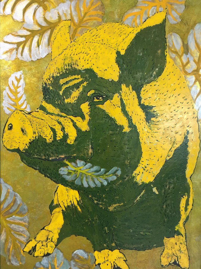 Với bức tranh “Lợn Mán” và “Tự họa năm Hợi” của họa sĩ Thành Chương, người xem dễ dàng nhận thấy ngôn ngữ hội họa rất đặc trưng của họa sĩ đó là những mảng màu nguyên, tươi rói, tương phản mạnh, đậm chất dân gian nhưng cũng rất hiện đại. Còn với tác phẩm “Sung mãn” và “Sung túc” của Lê Trí Dũng được gợi hứng từ tranh dân gian Đông Hồ, cùng hướng tới một năm Hợi no đủ, sum vầy, sinh sôi nảy nở.