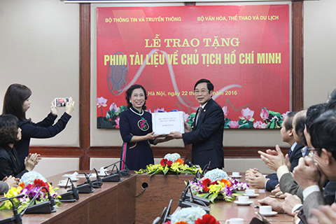 | Bộ trưởng Bộ Thông tin và Truyền thông Nguyễn Bắc Son trao tặng phim tài liệu về Chủ tịch Hồ Chí Minh cho bà Đặng Thị Bích Liên, Thứ trưởng Bộ Văn hóa, Thể thao và Du lịch. Ảnh: TXVN |