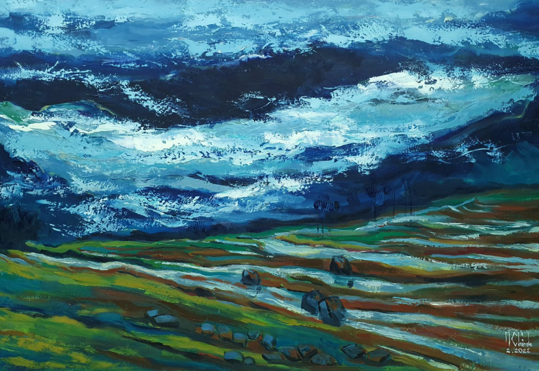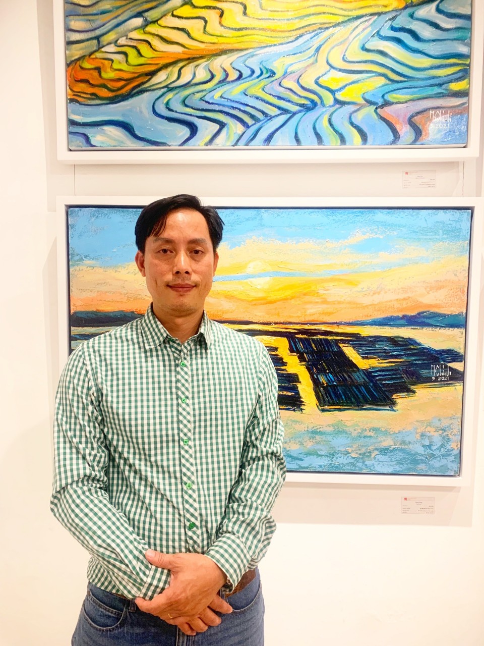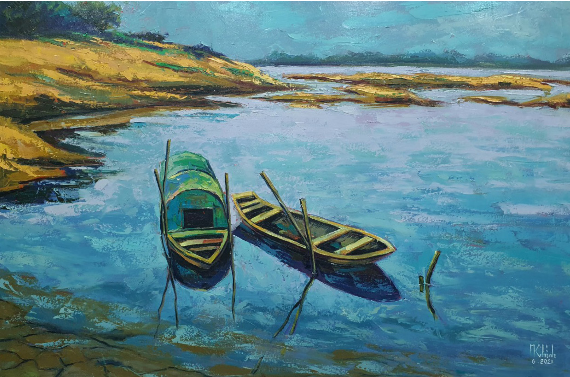 40 bức tranh trong triển lãm Bến Mây chủ yếu là những bức tranh phong cảnh được họa sĩ sáng tác trong hai năm Covid. Là người ham đi, khoảng thời gian ngồi yên quý giá cho anh thêm chiêm nghiệm vẻ đẹp của những vùng đất nơi mình đã đi qua.