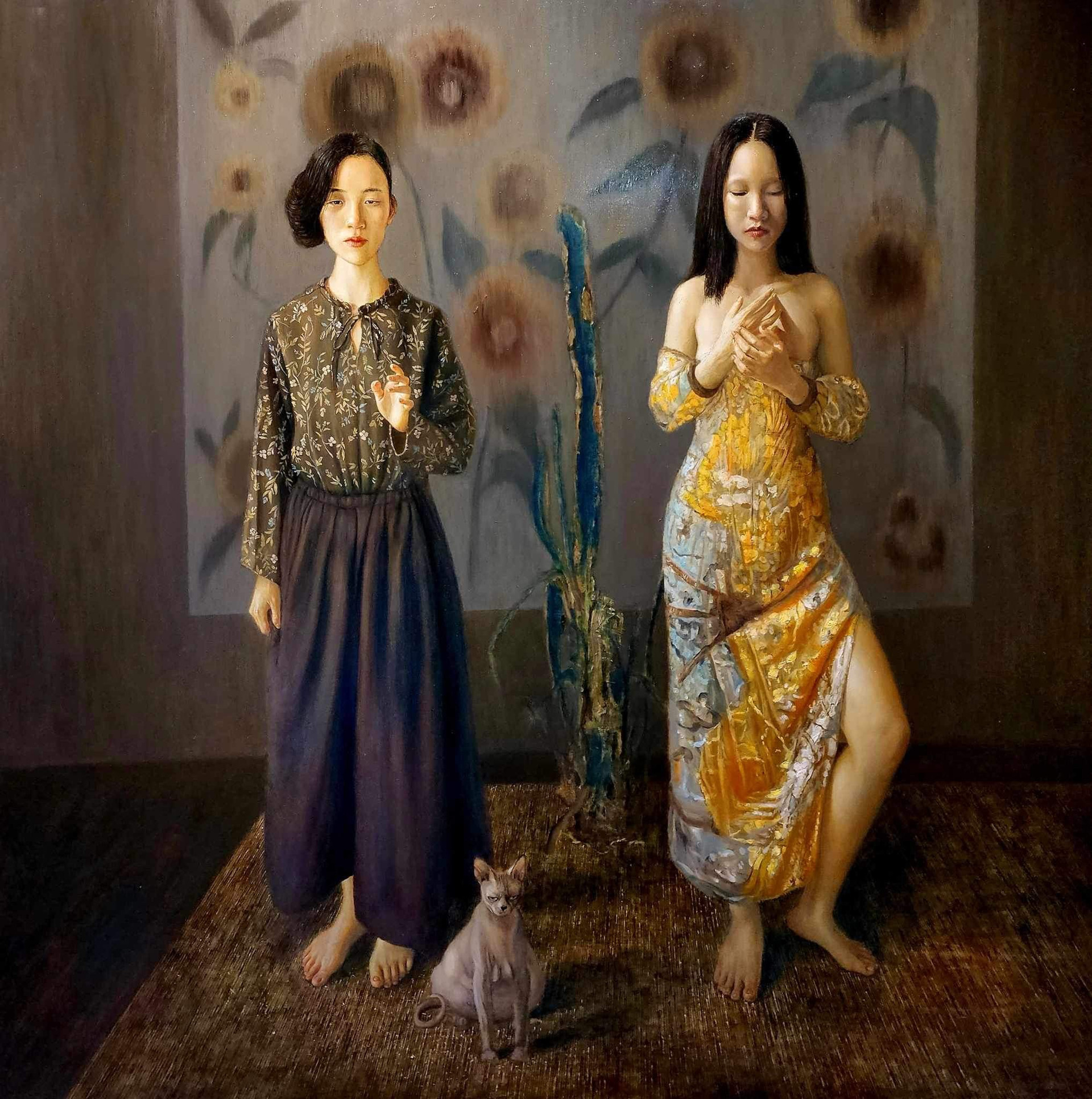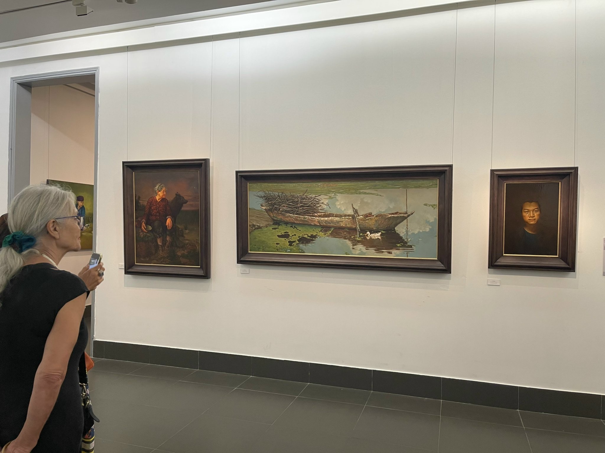 Họa sỹ Phạm Bình Chương chia sẻ, điều đáng mừng trong triển lãm lần này, là các hoạ sỹ trong nhóm Hiện thực đều cho thấy sự vững vàng và chín chắn hơn trong các tác phẩm của mình: “Họa sỹ Nguyễn Toán, từng đoạt giải Best of the show 2023 của tạp chí Watercolor Artist - Mỹ (năm 2022) với tác phẩm Vô thường, nay tiếp tục chắt lọc về hình, màu và ý tứ. Tư tưởng trong tranh Toán được thể hiện rõ, thuyết phục hơn. Họa sỹ Đoàn Văn Tới tiếp tục khai thác đề tài Phật pháp, song hình thức lại tươi trẻ, dễ xem hơn trước. Anh dùng thủ pháp vẽ lụa kết hợp cắt dán, thêu với bảng màu tươi sáng…