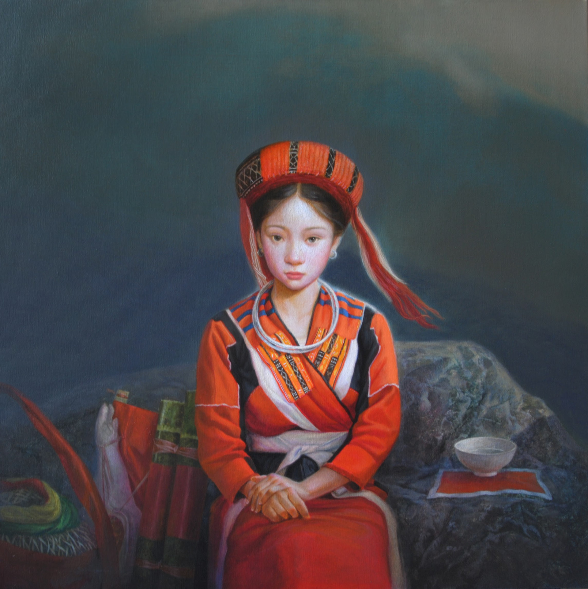 Lê Thế Anh chia sẻ: trong kỹ thuật vẽ sơn dầu, mỗi giai đoạn người họa sĩ đều phải hoàn thiện một kỹ năng nào đó, thì lần này với anh là sự thay đổi bảng màu: "Mọi người nhận xét bảng màu của tôi đã trầm hơn trước, hòa sắc không còn đối lập. Bố cục tranh cũng cận hơn, tôi không đặt nặng vào diễn tả không gian. Và cũng khác các họa sĩ hiện thực khác trong nhóm, có những người vẽ không gian, có xa gần, nhưng tôi khai thác không gian ẩn dụ nhiều hơn. Không phải không gian hiện thực, vì thế không gian rất hẹp. Kể cả màu của núi, của trời cũng không phải hiện thực mà là màu của ẩn dụ, của sự tượng trưng để lột tả tâm lý nhân vật tôi muốn diễn tả.”