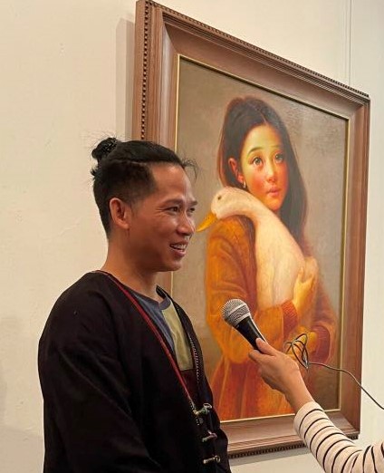 Họa sĩ Lê Thế Anh trả lời phỏng vấn VOV5 tại triển lãm. |