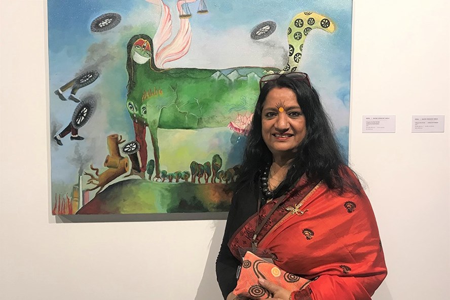 Nữ họa sĩ người Nepal Ragini Upadhyay Grela tham dự triển lãm với chùm 3 tác phẩm cùng có chủ đề bảo vệ thiên nhiên, môi trường, trái đất, và cùng bắt đầu bằng hai từ “Công lý”: “Công lý cho tự do”, “Công lý cho tự nhiên” và “Công lý cho mẹ trái đất”.