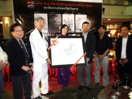 (VOV5) - Cuộc triển lãm tranh của 4 họa sĩ Thái Lan vẽ về kiến trúc Việt Nam xưa và nay vừa khai mạc tại thủ đô Băngcốc. Khoảng 180 bức tranh của bốn họa sĩ Thái Lan được trưng bày tại triển lãm mang tên “Kiến trúc Việt Nam xưa và nay” là những tác phẩm được các họa sĩ vẽ sau những chuyến đi tới khắp đất nước Việt Nam, thể hiện vẻ đẹp tinh tế của nhiều công trình, di tích cổ ở các danh lam thắng cảnh, cuộc sống sinh hoạt phong phú của từng vùng miền. Tham dự lễ khai mạc triển lãm, Đại sứ Việt Nam tại Thái Lan Ngô Đức Thắng đánh giá đây là một trong những hoạt động văn hóa đầy ý nghĩa, giúp người dân Thái Lan hiểu thêm về đất nước Việt Nam tươi đẹp, thanh bình, con người mến khách, góp phần xây dựng cộng đồng ASEAN đi lên trong bối cảnh mối quan hệ hữu nghị hợp tác Việt Nam-Thái Lan đạt tầm cao mới sau hơn 35 năm vun đắp.