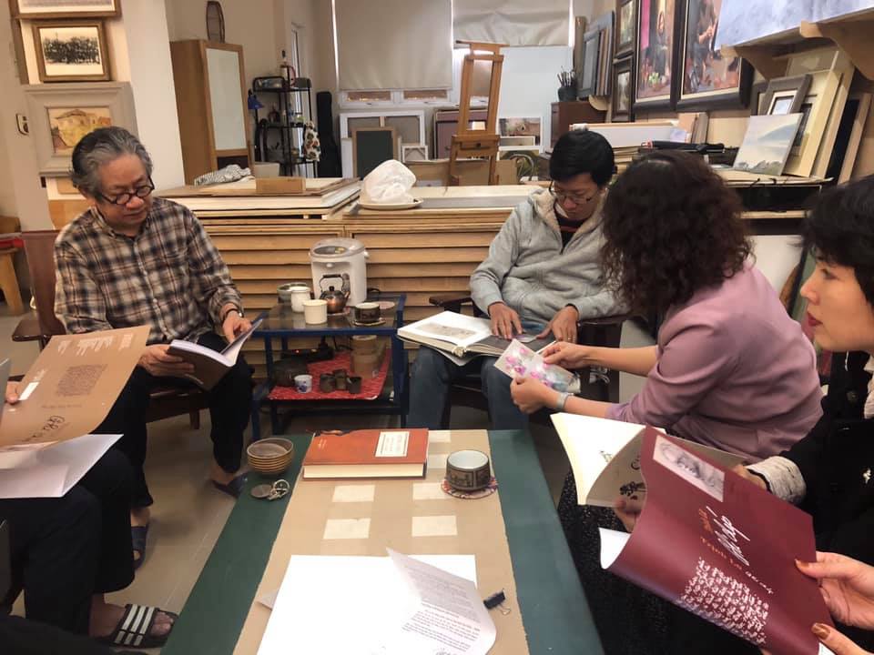 Họa sĩ Trịnh Lữ và các biên tập của đơn vị làm sách tại tư gia của ông - Ảnh: Fb nhân vật. |