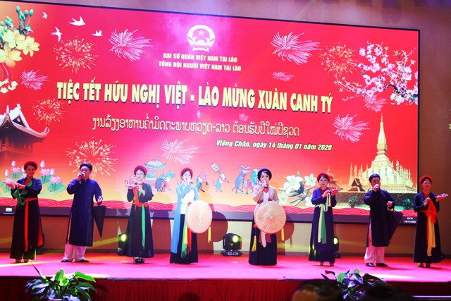 Tiệc chiêu đãi diễn ra trong bầu không khí vui tươi chào đón năm mới, thắm tình đồng chí với các món ăn truyền thống Việt Nam và các tiết mục văn nghệ đặc sắc ca ngợi mùa xuân, ca ngợi tình hữu nghị của hai nước Việt Nam và Lào.