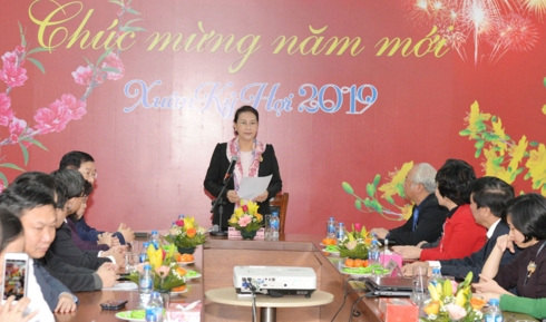 Tại bệnh viện, Chủ tịch Quốc hội đã tới Trung tâm ung thư – huyết học Nhi khoa thăm và ân cần trao quà cho các cháu nhỏ bị bệnh hiểm nghèo đang nằm trên giường bệnh. Chia sẻ với thân nhân các cháu phải điều trị bệnh xa nhà đúng vào dịp Tết đến xuân về, Chủ tịch Quốc hội Nguyễn Thị Kim Ngân động viên thân nhân các cháu có niềm tin và nghị lực vượt lên khó khăn, vững tin vào đội ngũ thầy thuốc của Bệnh viện Nhi Trung ương.