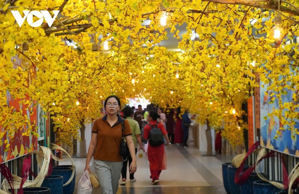 Diễn ra từ ngày 1/2 -21/2 (từ 14 tháng Chạp năm Ất Tỵ đến mùng 5 Tết Bính Ngọ 2026) tại Nhà Văn hóa Thanh niên Thành phố Hồ Chí Minh, Lễ hội Tết Việt tiếp tục mang đến nhiều không gian văn hóa đặc sắc, tái hiện nét đẹp Tết xưa, nổi bật là không gian “Đẹp xưa” với Phố ông đồ, Đường hoa mai, cây nêu ngày Tết, bếp xuân, luống hoa, làng nghề truyền thống, ụ rơm vàng… Phố ông đồ được đầu tư công phu cả về hình thức lẫn nội dung với sự tham gia của hơn 50 ông đồ trẻ yêu nghệ thuật thư pháp. Khu vực này nằm dọc tuyến đường Phạm Ngọc Thạch, Nguyễn Thị Minh Khai với hình ảnh mực tàu, giấy đỏ cùng những vật dụng trang trí gợi nhớ Tết xưa thu hút đông đảo du khách. Bên cạnh đó, không gian hoa mai ngày Tết với sắc vàng rực rỡ, tượng trưng cho may mắn, tài lộc, thịnh vượng, sức khỏe và hạnh phúc. Chị Trần Thị Hường (phường Linh Xuân, Thành phố Hồ Chí Minh) cho biết Lễ hội Tết Việt năm nay, chị Hường đặc biệt ấn tượng với không gian lung linh, rạng rỡ của đường hoa mai. Không gian hoa mai rạng rỡ cùng với tạo hình linh vật ngựa mạnh mẽ, khỏe khoắn như đang bay ra từ bông mai cho cảm nhận về một sức Xuân mạnh mẽ, khí thế vươn lên của quê hương, đất nước