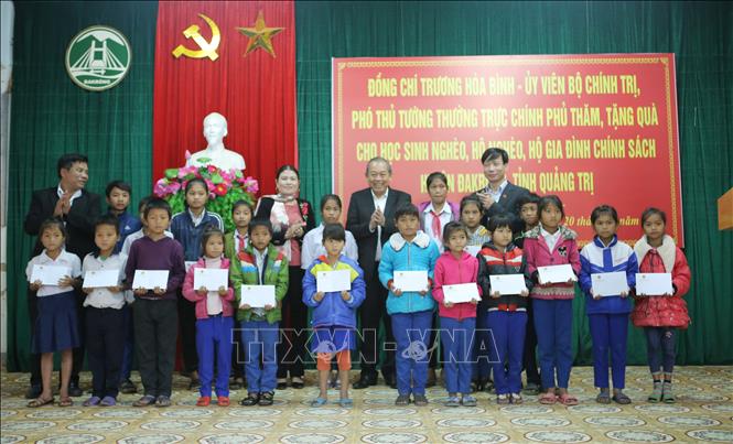 Phó Thủ tướng Thường trực Trương Hòa Bình tặng quà cho người nghèo huyện Đakrông - Ảnh: TTXVN |