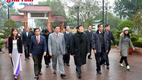 (VOV5) - Nhân dịp chuẩn bị đón chào năm mới Bính Thân 2016, hôm nay (30/1), Chủ tịch nước Trương Tấn Sang và đoàn công tác đã đến dâng hương tại khu tưởng niệm các Tổng bí thư Trần Phú, Hà Huy Tập, Lê Duẩn; thăm và chúc Tết Đảng bộ, chính quyền và bà con nhân dân huyện Đức Thọ và tỉnh Hà Tĩnh. Chủ tịch nước cũng đã tới thăm và chúc Tết cán bộ chiến sĩ Quân khu 4.