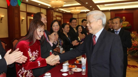 (VOV5) - Chiều ngày 30/1, Tổng Bí thư Ban Chấp hành Trung ương Đảng Cộng sản Việt Nam Nguyễn Phú Trọng tiếp đoàn đại biểu đại diện cho cộng đồng người Việt Nam ở nước ngoài về nước dự Chương trình Xuân Quê hương – 2016.